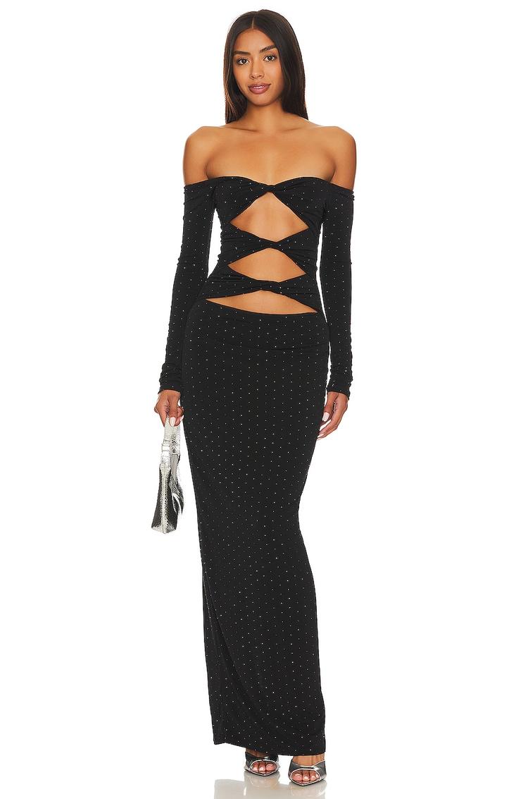 A bold silhouette defines this column maxi dress in matte black embellished crepe fabric, featuring a fitted cut that skims the body. The off-shoulder neckline with a twisted cut-out bodice adds an alluring modern edge, complemented by long sleeves and a clean hemline. Its concealed back zipper ensures a smooth finish. Ideal for date nights, cocktail parties, or a stylish night out, this sexy and trendy dress makes a striking statement while offering all-weather versatility.