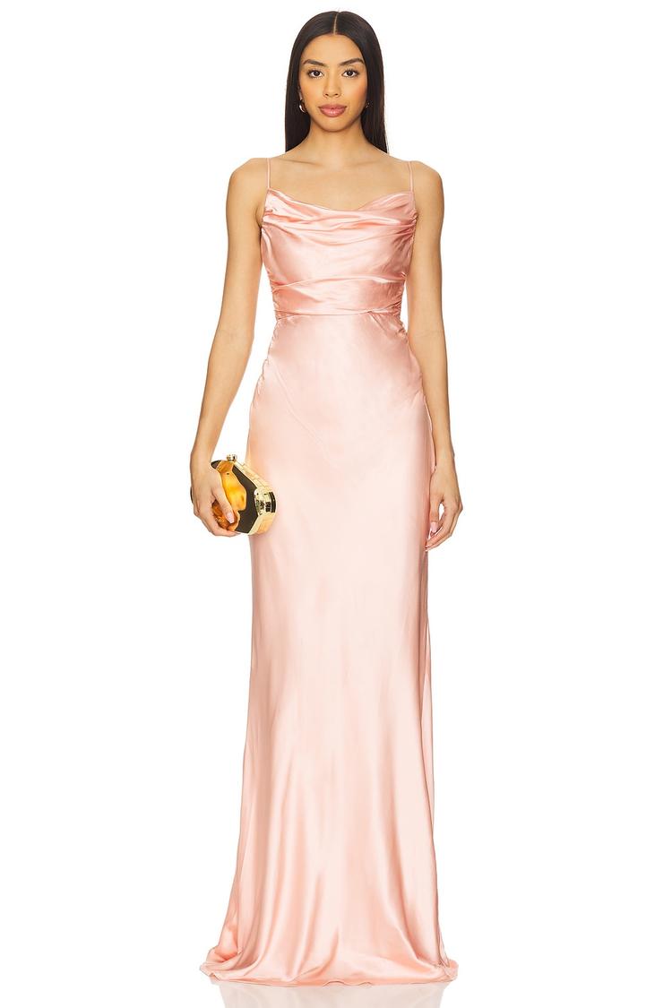 Soft charmeuse fabric in a shimmering peach hue accentuates this elegant column gown. The maxi length and fitted silhouette create a graceful flow, while the cowl neckline and spaghetti straps add a delicate allure. Ruched sides provide subtle texture and flattering shaping, complemented by adjustable shoulder straps for a custom fit. The hidden back zipper ensures a seamless finish. Perfect for formal evenings, cocktail parties, or romantic date nights, this gown blends sophisticated style with comfortable wearability for all-weather occasions.