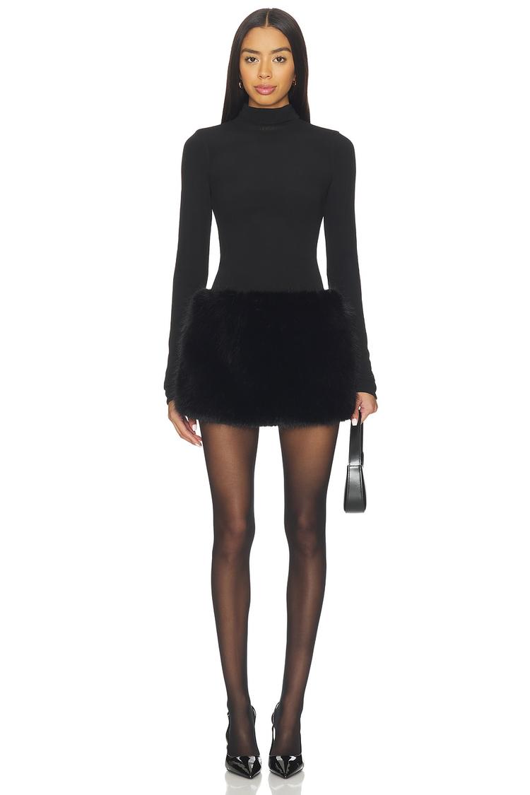 A sleek black shift mini dress featuring a cozy turtleneck and long sleeves crafted in heavyweight jersey fabric. The standout faux fur skirt adds texture and chic appeal, perfectly balancing warmth and style. This slim-fit silhouette with a concealed back zipper offers a modern, elegant look ideal for autumn and winter nights. Whether attending a cocktail party, date night, or a night out, this fully lined dress provides both comfort and sophistication.