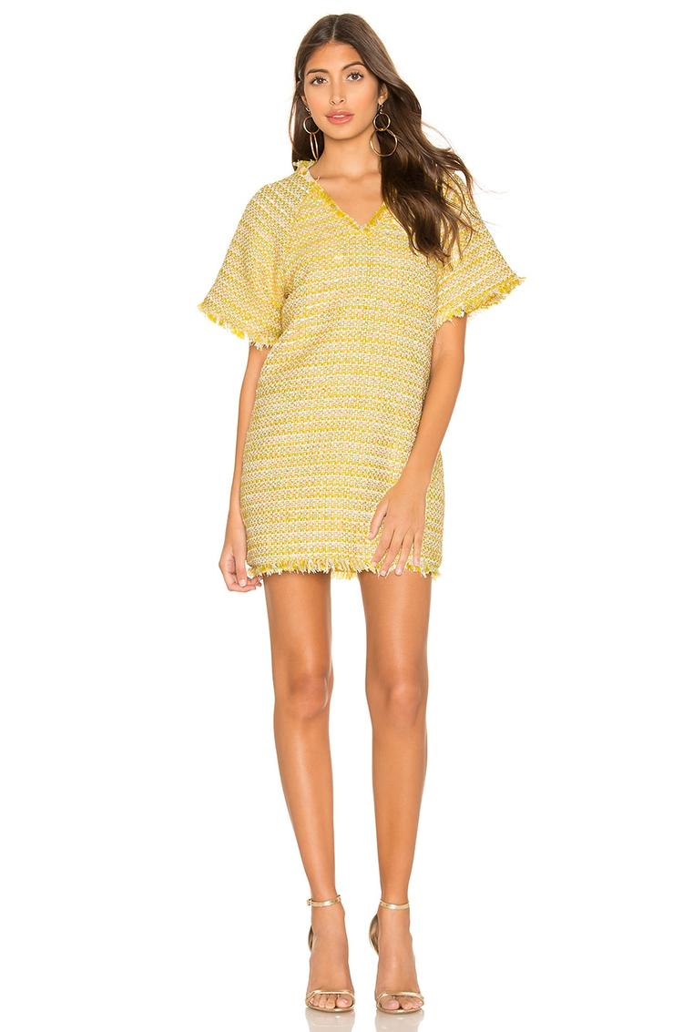Tweed texture and frayed edges add subtle texture to this matte yellow mini shift dress, featuring a relaxed fit and V-neckline for easy elegance. Its short sleeves and fringed raw-edge hem complement a casual chic vibe perfect for spring and summer occasions like brunch, date nights, or evening outings. Fully lined polyester fabric ensures comfort and structure, making it a versatile piece for both daytime and night events.