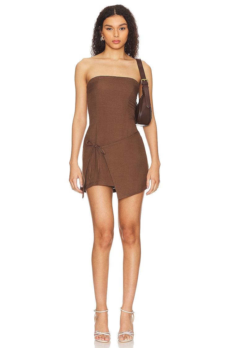 Soft matte brown linen blend fabric shapes this fitted mini wrap dress, featuring a strapless straight neckline and a delicate front tie ribbon detail. The hidden back zipper ensures a smooth, sleek silhouette, while the lightweight material offers breathable comfort perfect for warmer seasons. Its clean hemline and simple elegance make it an ideal choice for daytime occasions like brunch with friends or casual date nights, blending classic style with casual chic vibes effortlessly.