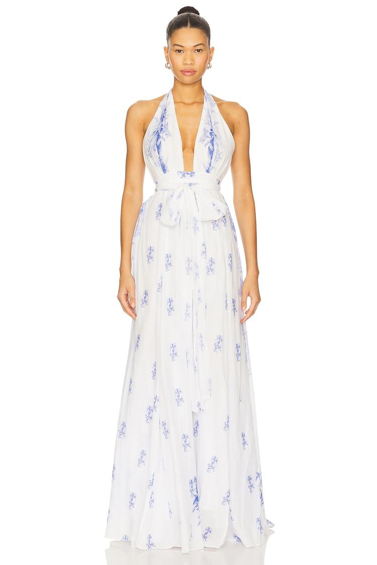 Soft cotton voile and a flowing A-Line maxi silhouette combine to create an effortlessly romantic look. The halter neckline and open back add alluring details, while the delicate blue floral print on white fabric evokes classic bohemian charm. This fully lined dress offers pull-on styling with an optional tie closure for comfort and ease. Ideal for spring and summer, it transitions seamlessly from sunlit brunches to vacation evenings and date nights, making it a versatile and dreamy addition to your warm-weather wardrobe.