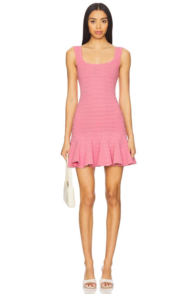 Soft cotton knit with a touch of elastane shapes this pink fit and flare mini dress featuring micro-cutouts throughout for subtle texture. Wide straps and a flattering U-neckline frame the fitted bodice, while ruffled hems add playful movement. Perfectly suited for warm spring and summer days, it’s an ideal choice for casual outings, brunch dates, or relaxed evenings out. The pull-on style offers easy wearability, making this dress a chic yet comfortable option for everyday and weekend wardrobes.