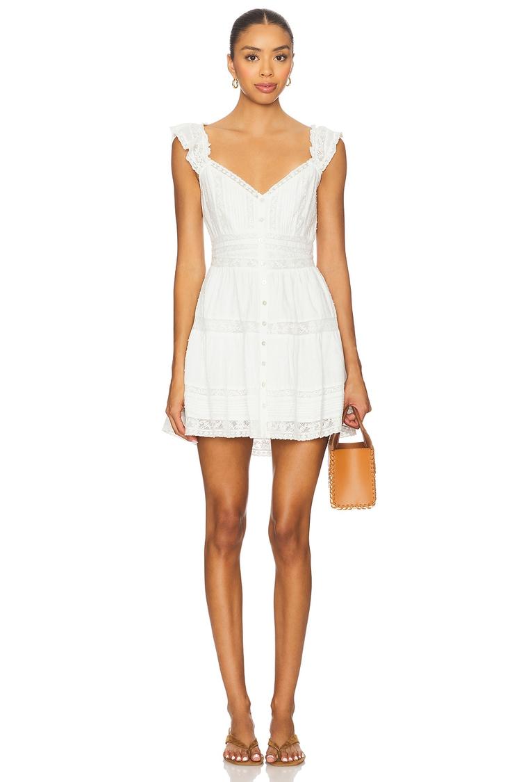 Soft cotton fabric and delicate lace trim create a romantic and classic mini dress perfect for spring and summer. Featuring a sweetheart neckline and cap sleeves with ruffled detailing along the hem and sleeves, this A-line silhouette offers a regular fit that flatters effortlessly. The front button closure adds subtle charm, while the fully lined construction ensures comfort. Ideal for brunch, casual outings, or date nights, this dress blends bohemian elegance with timeless style.