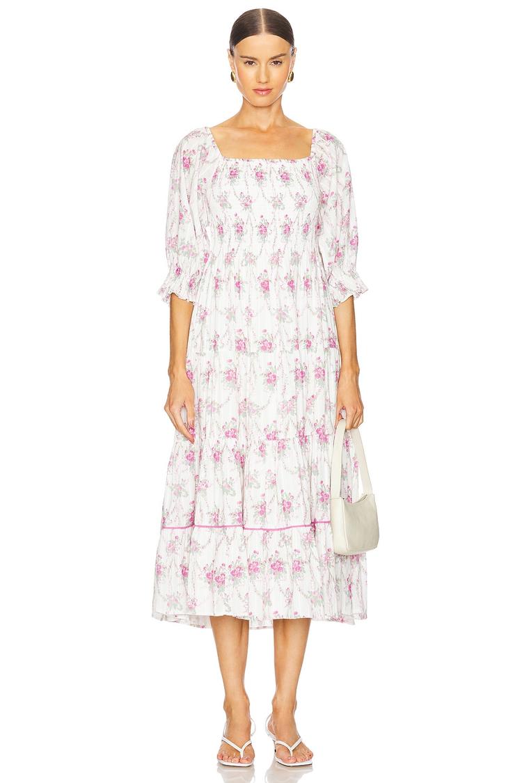 A lightweight poplin silhouette with romantic smocked bodice and ruffled hem defines this midi babydoll dress. The square neckline and airy balloon half sleeves add a breezy, elegant touch, perfect for spring and summer days. Fully lined for comfort and featuring handy side seam pockets, this white and pink floral dress blends silk and cotton for a soft, breathable feel. Ideal for brunch outings, vacation strolls, or casual date nights, it offers effortless charm and relaxed fit with a feminine boho chic vibe.