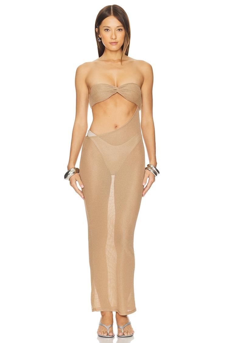 Sheer nylon fabric with metallic lurex fibers creates a shimmering, figure-hugging column silhouette that flows to a clean maxi hem. The strapless, open back design and cutout details emphasize a sexy, modern fit perfect for summer nights. This bodycon maxi dress offers a daring yet elegant vibe ideal for date nights, cocktail parties, or glamorous night outs where making a statement is key.