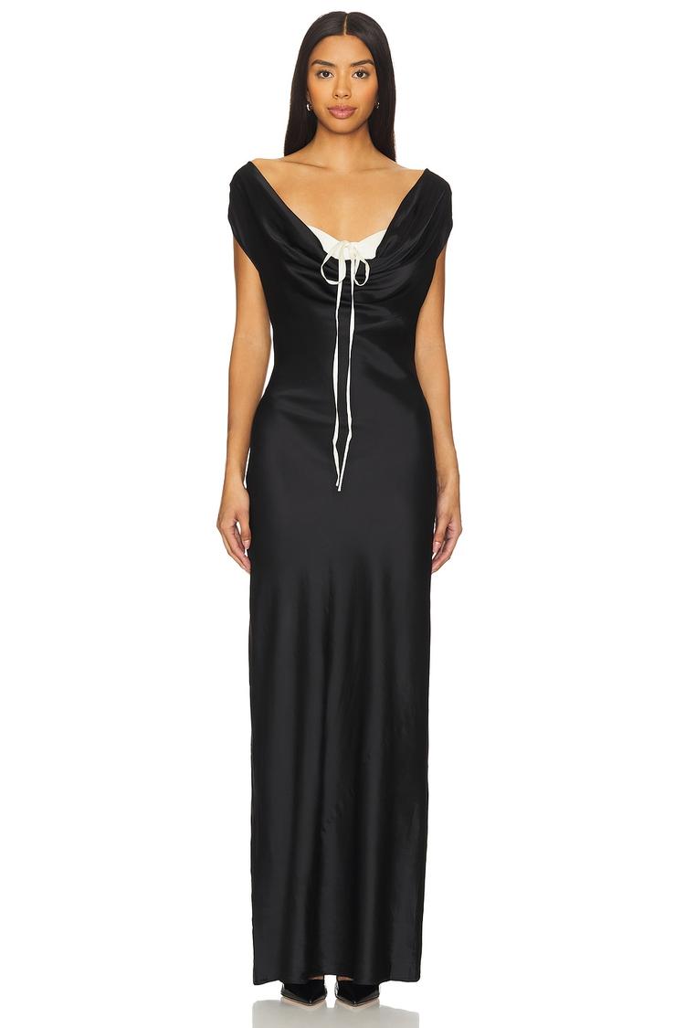 Soft matte black viscose with a hint of elastane creates a sleek, figure-hugging column silhouette in this maxi gown. The elegant cowl neckline and wide sleeveless straps offer a minimalist yet sophisticated appeal, while the delicate white bow detail at the front adds a subtle feminine touch. Fully lined for comfort, this pull-over style gown features adjustable detachable bra straps for a custom fit. Ideal for formal evenings, cocktail parties, and romantic date nights, it blends effortless elegance with modern refinement.