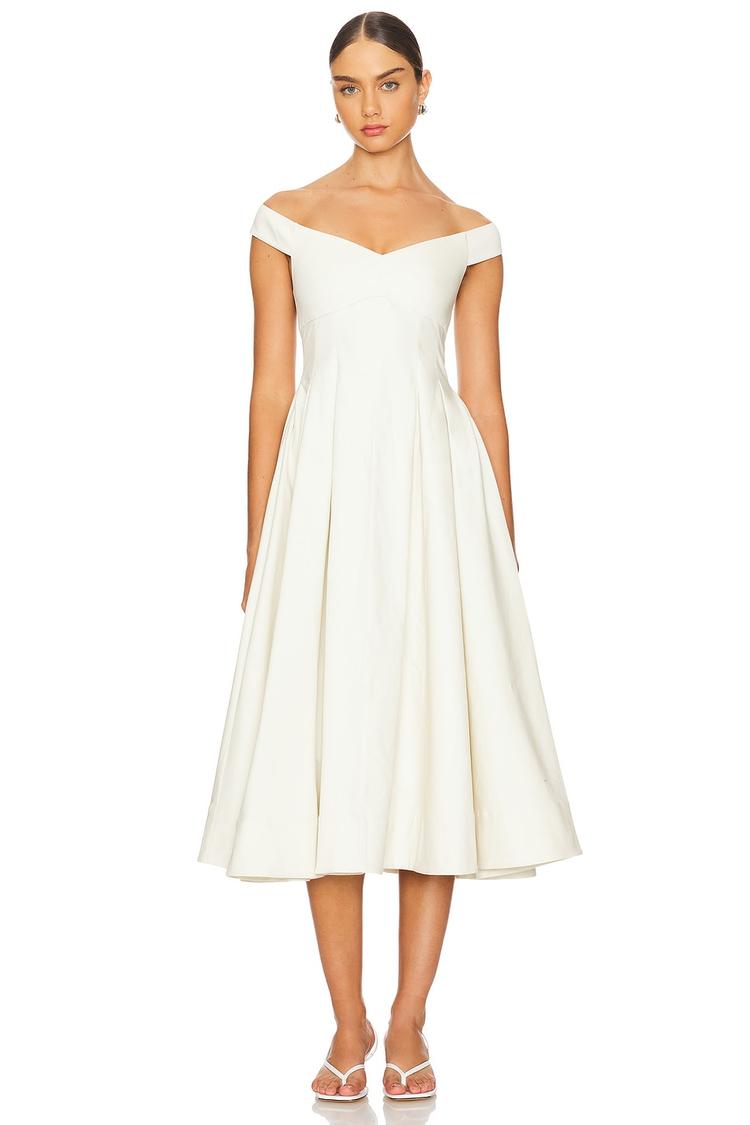Off-shoulder elegance meets structured charm in this white A-Line midi dress. Crafted from a heavyweight cotton-elastane blend, it offers a fitted silhouette enhanced by pleats at the hip for graceful movement. The invisible back zipper ensures a seamless look, while wide straps and a clean hemline add to its classic appeal. Ideal for spring and summer occasions, this versatile piece shines at brunch, cocktail parties, or date nights, combining comfort with timeless style.