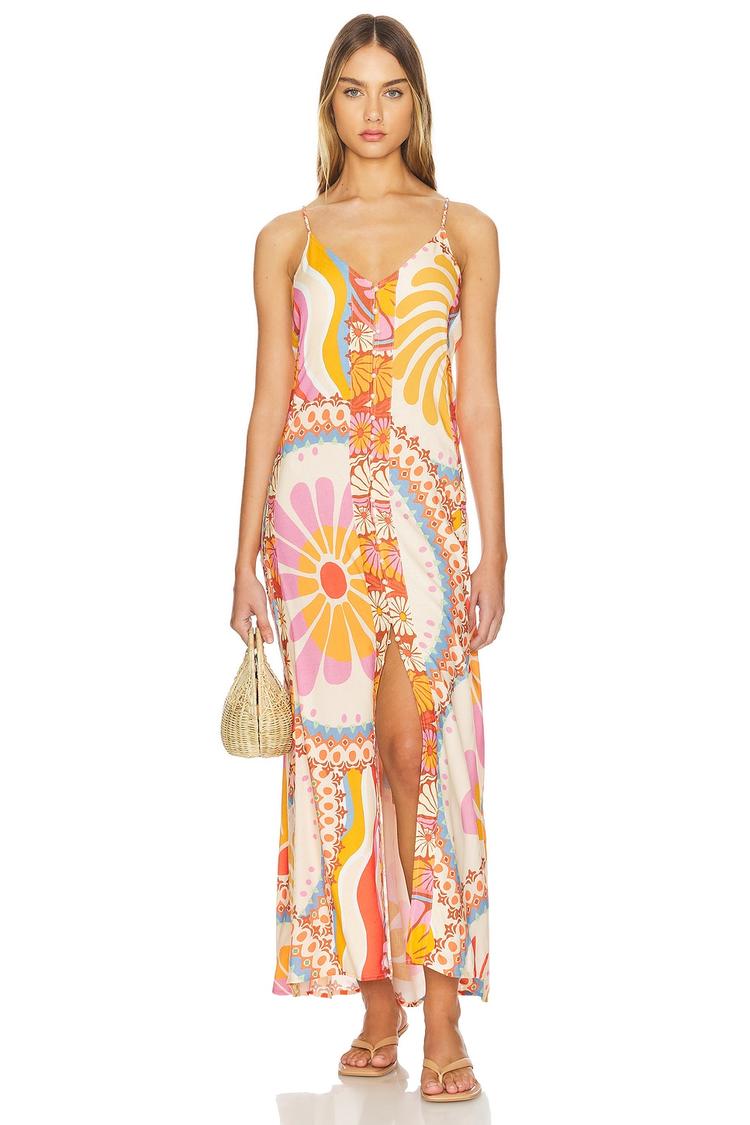 Sun-drenched days call for this flowy maxi slip dress featuring an abstract floral print in soft beige, pink, yellow, and orange hues. The V-neckline and spaghetti straps with adjustable ties complement an open back for a breezy, effortless vibe. Crafted from eco-friendly viscose, it offers a light, breathable feel perfect for spring and summer. The partial front button closure and side slit add subtle detail and ease of movement. Ideal for casual outings, beach vacations, or brunch dates, this bohemian chic piece blends comfort and style seamlessly.