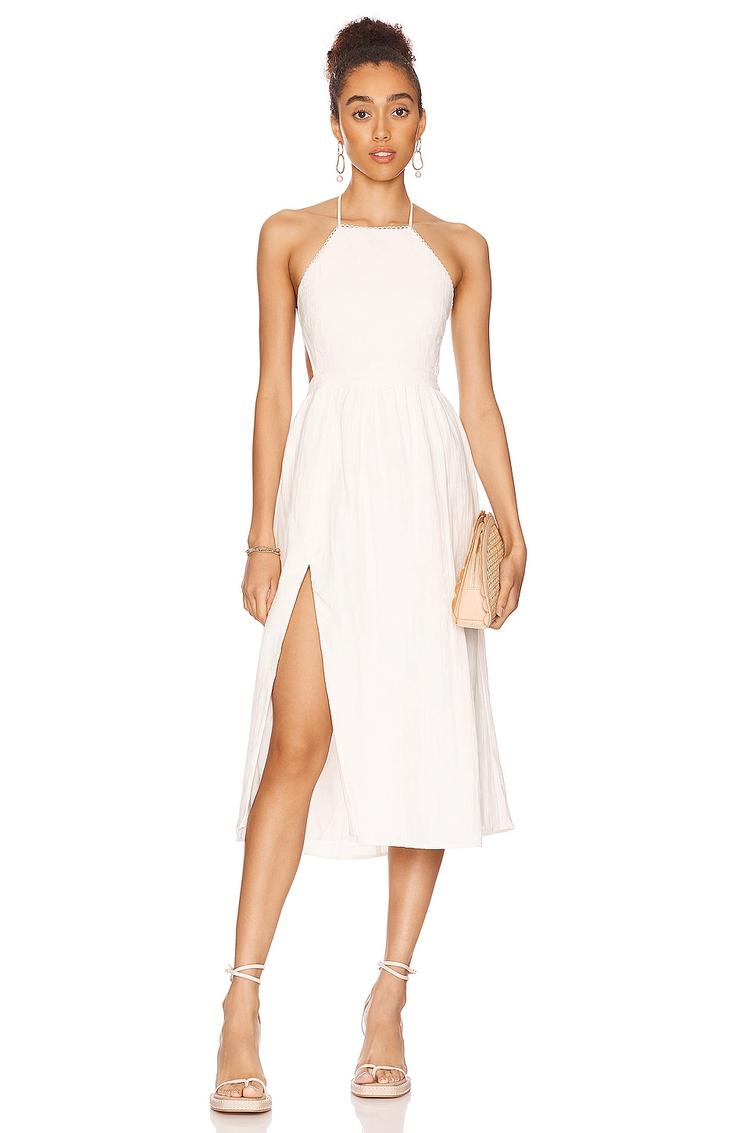 Soft jacquard cotton-linen blend fabric with delicate embroidered floral patterns creates an elegant and romantic A-Line midi dress. The high neckline and sleeveless silhouette combined with adjustable back ties and a concealed zip closure ensure a flattering regular fit. A chic side slit adds a subtle allure to the clean hemline. Ideal for spring and summer occasions, this versatile piece suits brunches, date nights, and wedding guest events with effortless style and comfort.