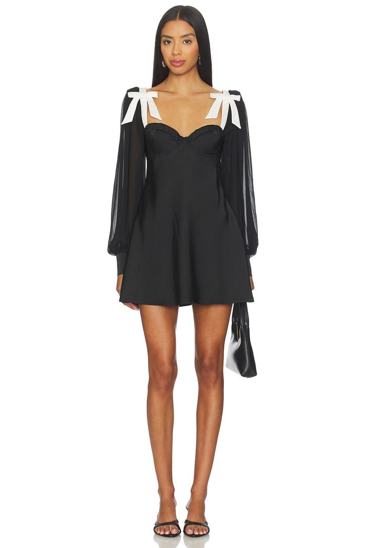 Delicate satin bows and sheer balloon sleeves elevate this matte black babydoll mini dress with a sweetheart neckline and flared fit. The hidden back zipper and tie-back shoulder strings add subtle sophistication, while the ruched underwire cups enhance the silhouette. Crafted in smooth polyester fabric, this versatile mini dress suits all-weather wear and shines at cocktail parties, date nights, or stylish evenings out. The clean hemline and contrasting white bows create a chic, elegant vibe perfect for confident, fashion-forward moments.