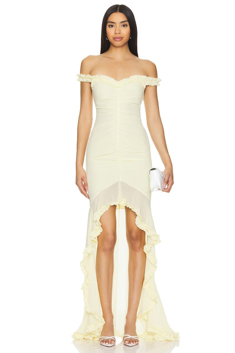 Soft chiffon and a figure-hugging sheath silhouette create an elegant look with a romantic flair. The off-shoulder sweetheart neckline and ruffled sleeves add delicate detailing, while the high-low ruffled hem brings dynamic movement to this cream gown. Partially lined for comfort, its fitted cut and hidden back zipper closure ensure a sleek finish. Ideal for cocktail parties, formal events, or as a wedding guest dress, this gown offers sophisticated style suitable for spring and summer occasions.