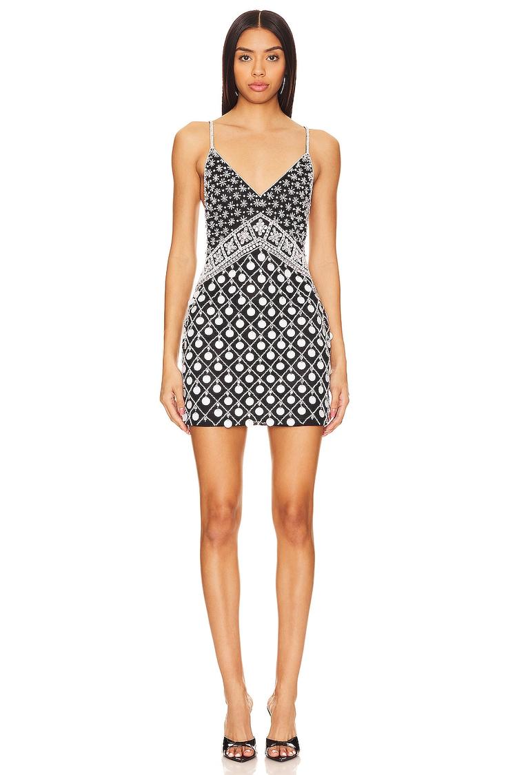 A dazzling bodycon mini dress featuring a black and white abstract pattern accented with shimmering beads and sequins. The V-neckline and spaghetti straps with adjustable crisscross back create a sleek, flattering silhouette. Crafted from midweight polyester fabric, this fully lined dress offers a comfortable fit ideal for cocktail parties, holiday celebrations, and night outs. The concealed back zipper ensures a seamless look while the clean hemline adds to the sophisticated appeal. A standout piece that radiates elegance and festive charm.