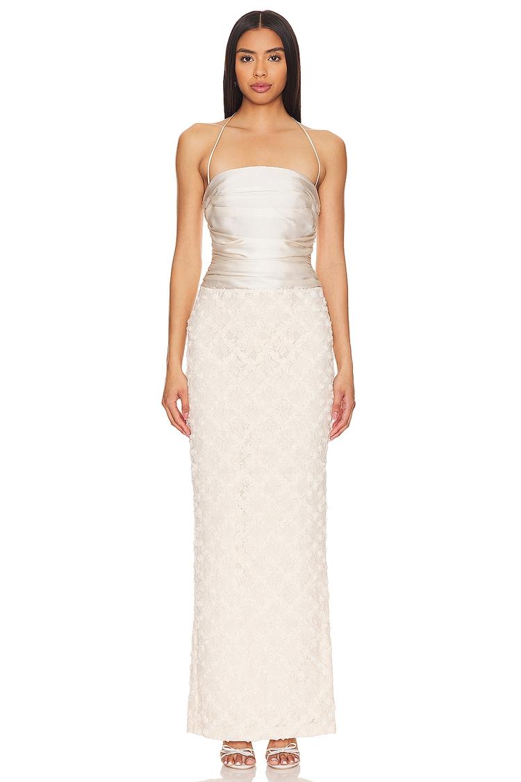 Soft ivory satin ruched at the bust transitions into delicate lace, creating a column silhouette that exudes romantic elegance. The halter neck with a tie-back adds a sophisticated touch while the back slit enhances graceful movement. Fully lined for comfort, this maxi gown is perfect for cocktail events, semi-formal occasions, and date nights. The concealed back zipper ensures a sleek fit, making it a standout piece for your special wardrobe moments.