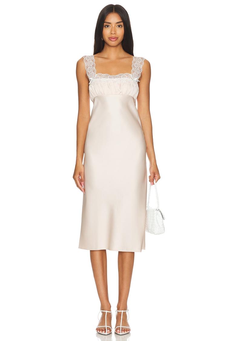 Soft matte off-white satin fabric defines this elegant slip dress with its contouring slim fit and classic midi length. The square neckline and wide shoulder straps are beautifully adorned with delicate lace trim, adding a romantic and refined touch to the minimalist silhouette. A concealed back zipper ensures a smooth finish, while the covered back complements the clean hemline. Ideal for spring and summer occasions, this versatile piece suits cocktail parties, date nights, and stylish brunches with ease.