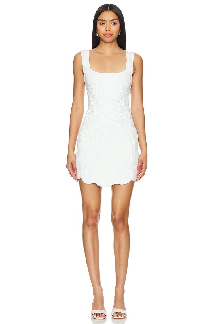 A sleek silhouette defined by a tight bodycon fit and mini length, this white Merida Mini Dress features a flattering square neckline and wide straps for a modern touch. Crafted from a midweight ribbed knit blend of viscose, nylon, and elastane, it offers comfortable stretch and a clean, minimalist look. The scalloped hem adds delicate detailing, perfect for spring and summer occasions like brunch, casual outings, or date nights. Slip it on easily for an effortlessly chic and versatile style.