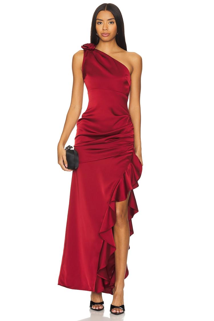 A striking matte red column gown with a sophisticated one-shoulder neckline and a fitted silhouette that accentuates the figure. Crafted from smooth polyester fabric, this maxi dress features elegant ruffled detailing cascading along the asymmetric hemline and skirt, complemented by a daring side slit for added allure. The concealed side zipper ensures a seamless fit. Perfect for cocktail events, formal occasions, and black tie optional affairs, this gown brings timeless elegance and modern flair to your wardrobe.