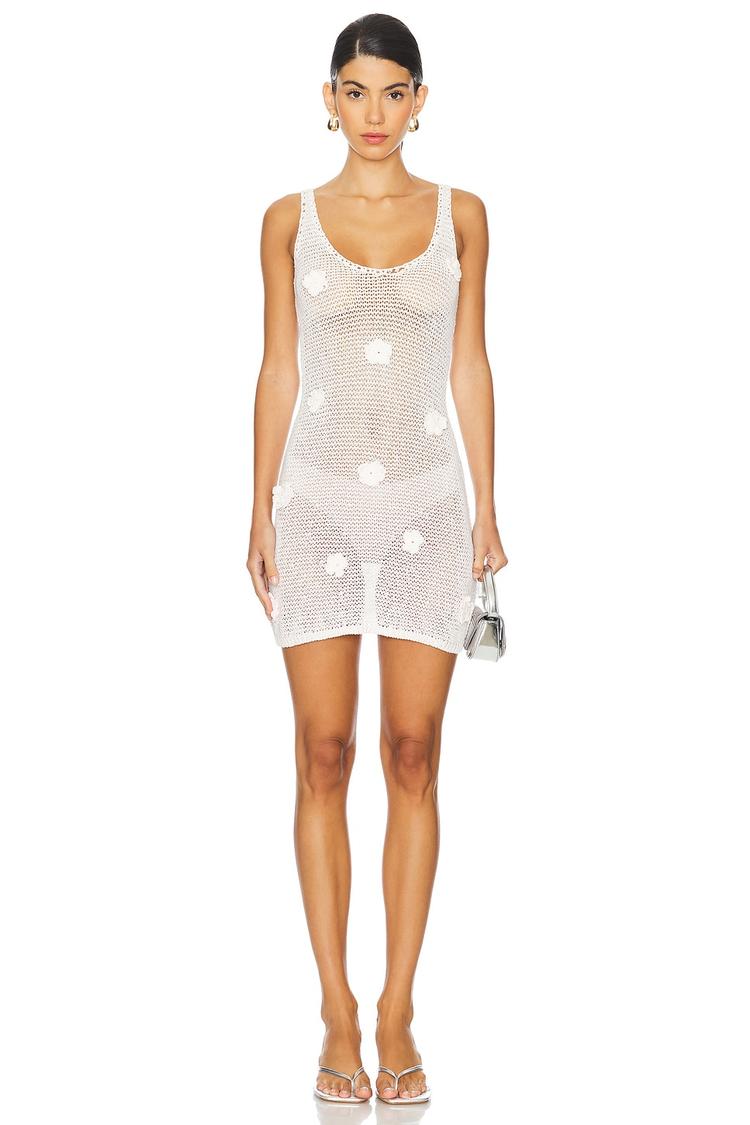 Delicate open crochet fabric with floral appliques creates an airy, bohemian vibe in this white mini shift dress. The sleeveless design with wide straps and a U-neckline complements the loose, comfortable fit, perfect for warm spring and summer days. The sheer texture adds a playful edge, making it ideal for casual beach outings, vacation escapes, or relaxed daytime events. Crafted from a cotton-nylon blend, it combines breathability with subtle stretch for easy pull-on styling and effortless wearability.
