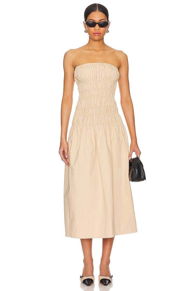 Smocked poplin fabric and a strapless neckline define the Vanna Midi Dress, creating a flattering fit and flare silhouette that enhances your figure. The mid-length hem and fitted bodice with smocking offer a timeless beige look perfect for spring and summer events. Ideal for birthday brunches, special occasions, and casual elegant outings, this dress combines comfort with classic style. Crafted from breathable cotton with a touch of elastane and rayon lining, it ensures ease of wear and a polished finish.