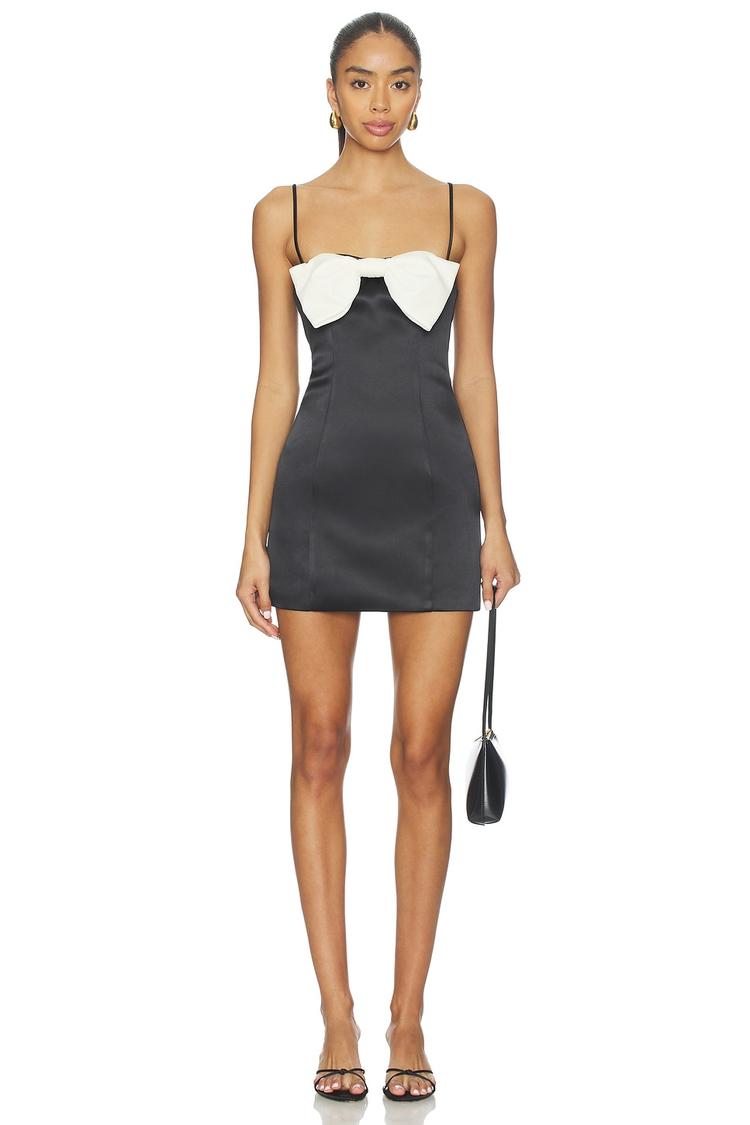 Sleek satin fabric and a bodycon slip silhouette create a striking look with a mini hemline that's perfect for warm seasons. The straight neckline features elegant off-white bows that add a touch of feminine charm to the matte black base. Thin spaghetti straps and a covered back enhance the minimalist yet sexy vibe, making it ideal for cocktail parties, night outs, or date nights. This modern mini dress offers effortless style and sophistication, perfect for occasions that call for a polished, confident statement piece.