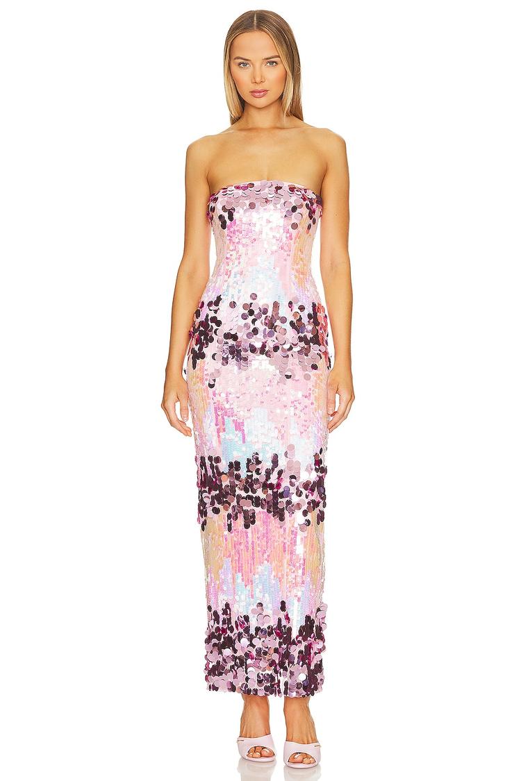 Iridescent pink hues and shimmering sequins create a radiant effect in this fitted corset dress featuring a straight neckline and strapless sleeveless styling. The lightly padded underwire cups and boned bodice enhance the silhouette, while a concealed back zipper and back vent ensure comfort and ease of movement. Perfect for formal occasions such as galas, weddings, cocktail parties, and proms, this midi-length gown combines elegance and sophistication with a dazzling play of light from the sequin embellishments all over the dress.