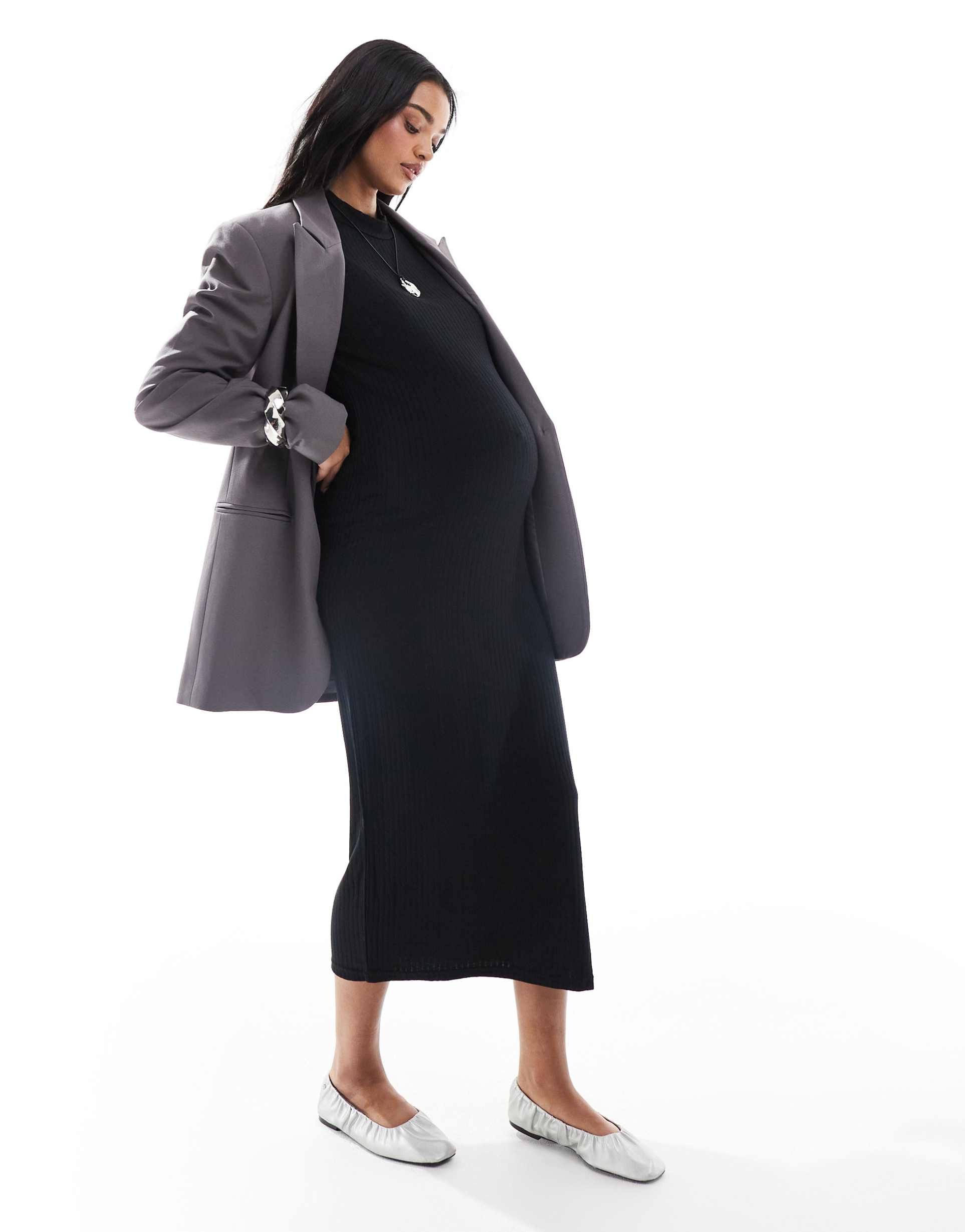 Mamalicious Maternity soft high neck ribbed long sleeved midi dress in black