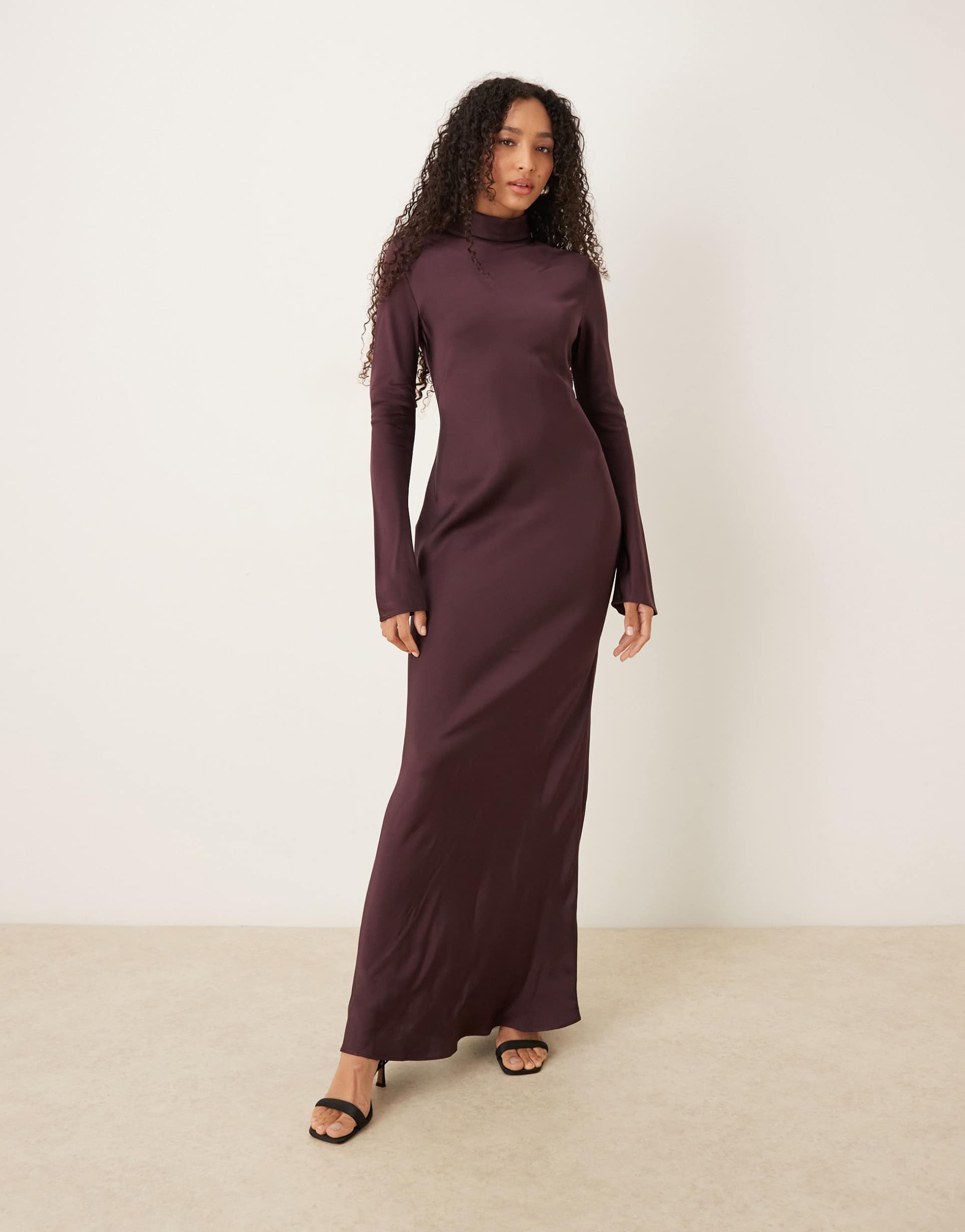 MANGO CAPSULE HIGH NECK SATIN BIAS CUT MAXI DRESS IN DEEP PLUM