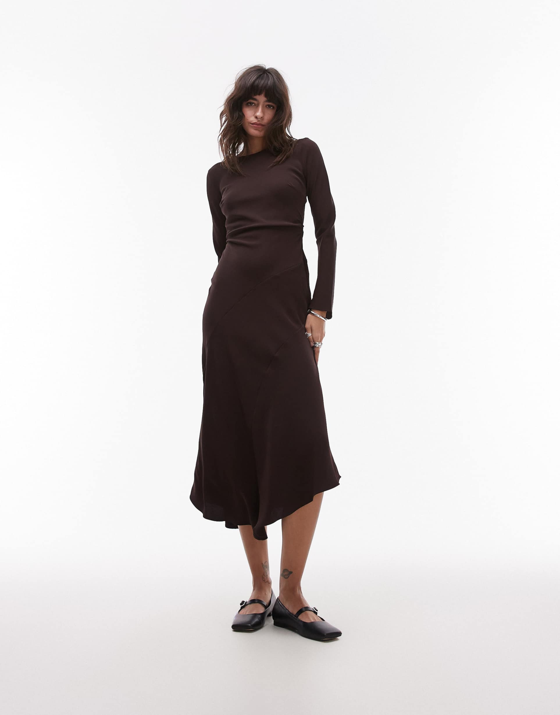 Effortless sophistication for everyday moments, this rich chocolate-brown long-sleeve dress from Mango features a crew neckline, a ruched waist with panel detailing, and an asymmetric maxi hem for subtle drama. Made in wrinkle-resistant polyester, it falls in a regular-fit silhouette that drapes from the waist for a flattering, feminine shape. A discreet back zip closure keeps the lines clean, while the tailored sleeves and refined finish create a versatile piece you can elevate with heels or keep casual with flats. Perfect for office days, weekend brunch, or a refined evening outâtimeless and endlessly wearable.