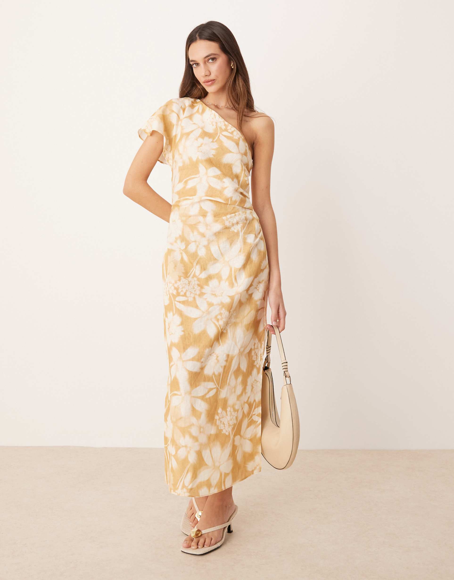 MANGO ONE SHOULDER FLORAL MIDAXI DRESS IN BUTTERMILK