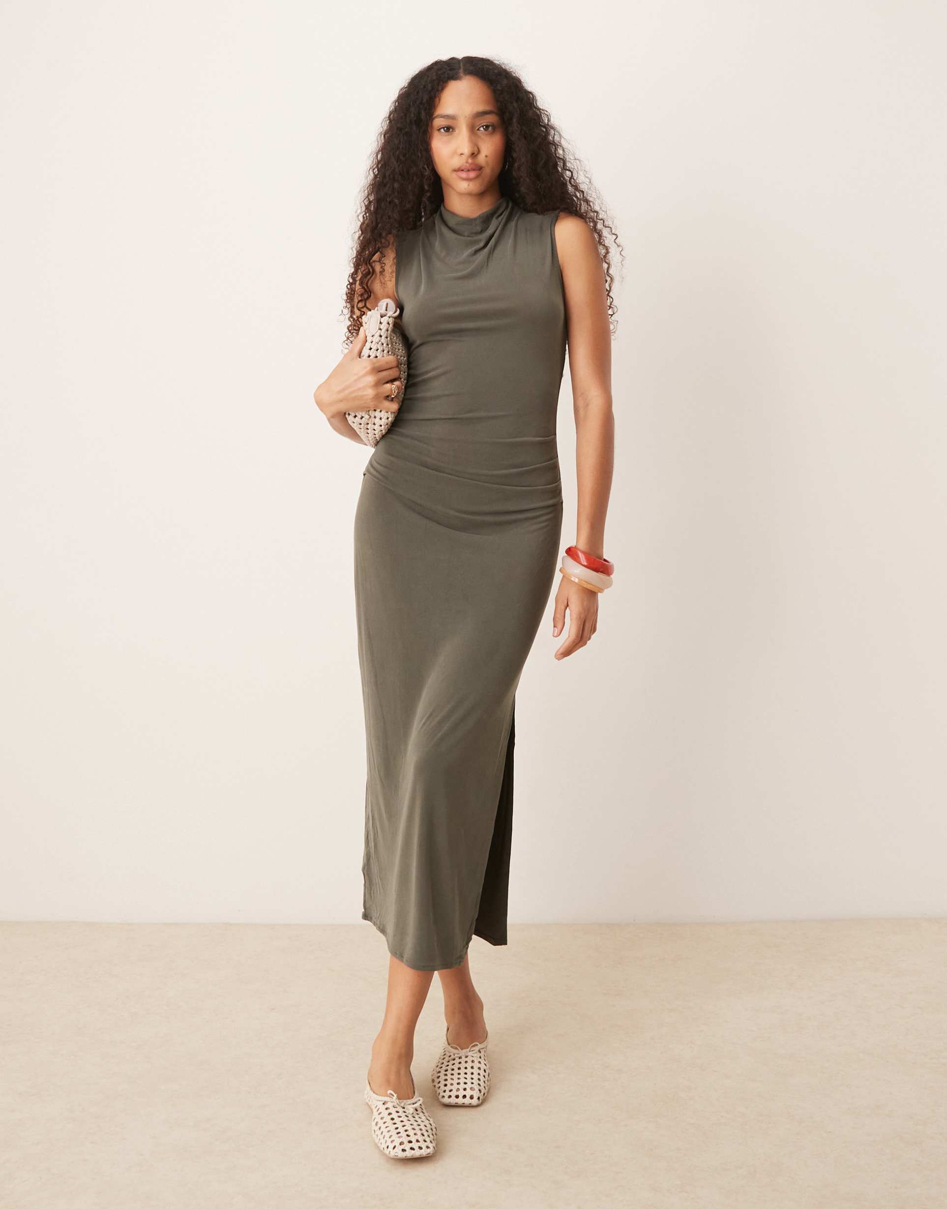 MANGO SOFT TOUCH RUCHED MIDAXI DRESS IN WASHED KHAKI