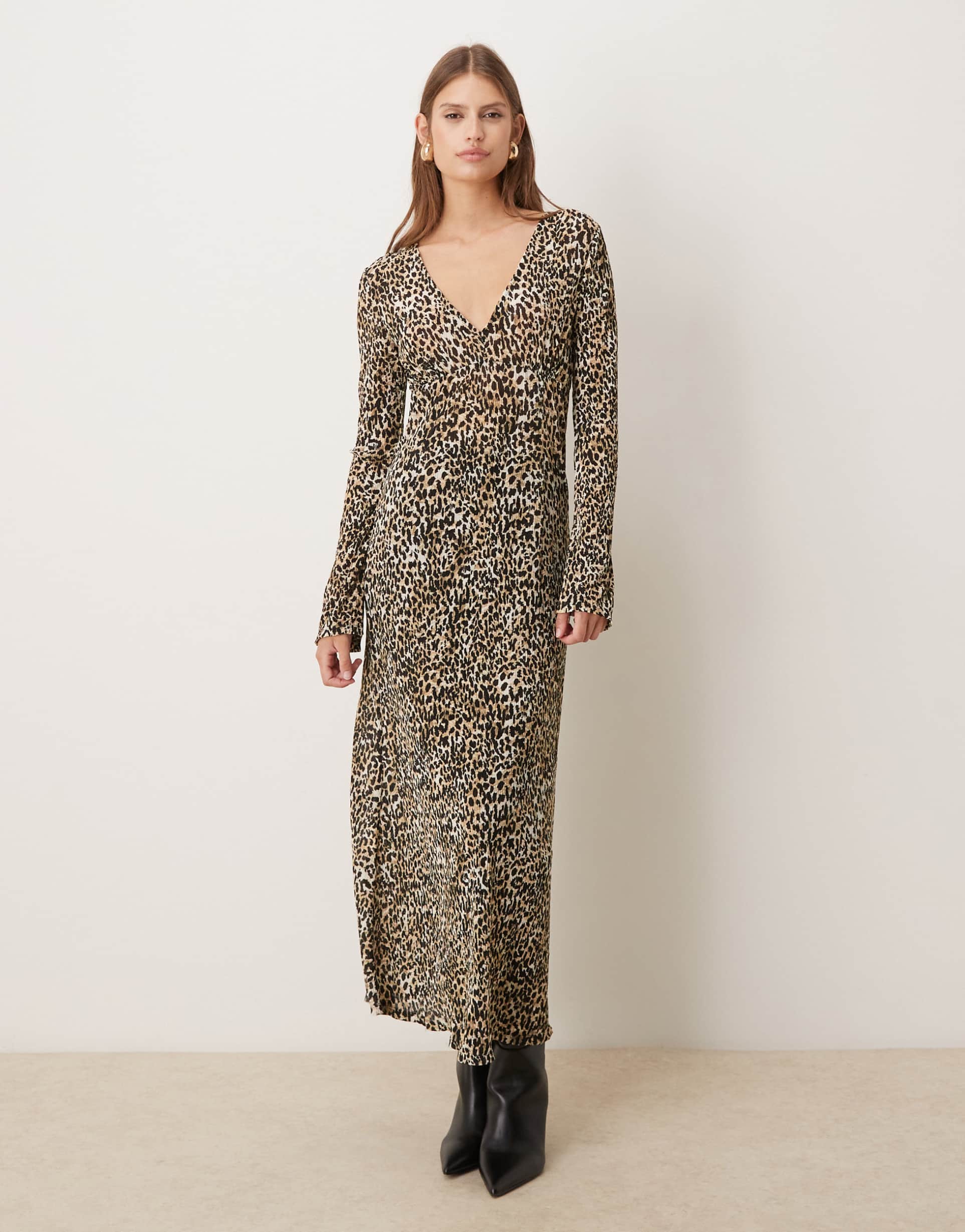 MANGO V NECK LONG SLEEVE PLISSE MIDI DRESS IN LEOPARD PRINT