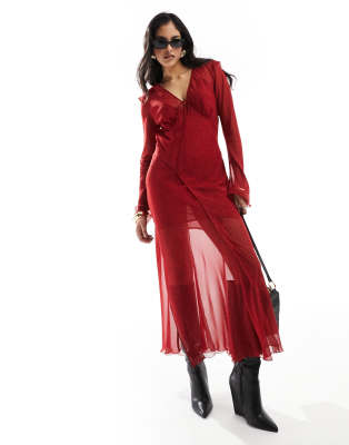 Light and airy chiffon in a sheer red hue with subtle polka dot texture creates a delicate silhouette in this midi dress. The v-neckline and long sleeves balance elegance with a comfortable regular fit, enhanced by a tie-up closure at the front. The dress flows with a raw edge hem, making it perfect for spring to autumn occasions like cocktail parties, night outs, and romantic date nights. Its classic style and lightweight polyester fabric ensure breathability and effortless grace for versatile wear.