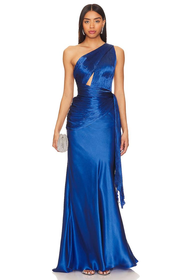 Luxurious satin-finish silk shapes an elegant column silhouette with a maxi length and fitted cut, perfect for formal evenings and galas. The gown features an asymmetric one-shoulder neckline with a striking front cut-out and delicate draped fabric on the side, creating a sophisticated and timeless look. A concealed back zipper ensures a smooth fit, while the rich dark blue color enhances its classic appeal. Ideal for black tie events, cocktail parties, and wedding guests, this gown combines refined style with exquisite craftsmanship.