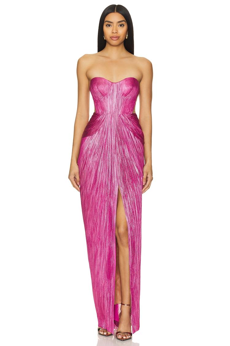 Shimmering fuchsia lame fabric and a column silhouette define this elegant gown with a flattering sweetheart neckline and strapless design. The fitted bodice features boning and side cut-outs, enhanced by a lace-up tie-back closure, while all-over ruching adds texture and sophistication. A thigh-high slit completes the flowing maxi length, perfect for formal events, gala evenings, or cocktail parties. Crafted from a lightweight nylon and spandex blend, this gown promises comfort and style with a striking silhouette that commands attention.