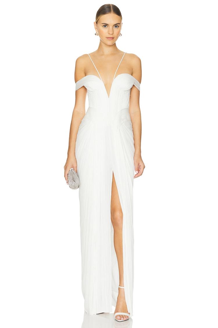 A sleek column silhouette crafted in smooth white silk with a fully lined boned bodice offers structured elegance. This maxi gown features a daring plunge neckline complemented by delicate cold-shoulder straps and adjustable shoulder ties for a perfect fit. The front slit adds subtle allure, while the hidden back zipper and cross tie closure enhance the streamlined look. Ideal for formal events, cocktail parties, or as a stunning wedding guest dress, this sophisticated gown transitions beautifully through spring, summer, and all-weather occasions.
