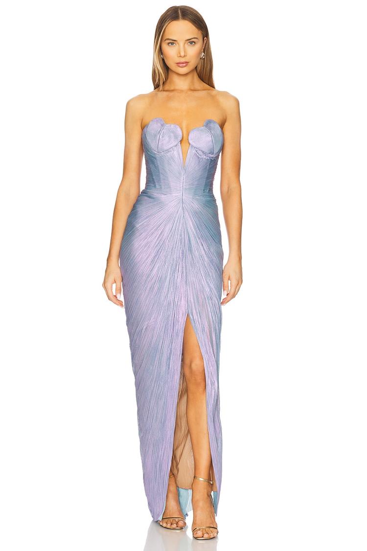 Shimmering light purple silk shapes a fitted corset dress with a sweetheart neckline and strapless silhouette. The gown features a boned bodice with underwire cups and elegant draping extending from the front hem slit to the back, creating a flowing maxi length ideal for formal occasions. A hidden back zipper and delicate lace-up tie closure ensure a flawless fit. This sophisticated silk gown transitions beautifully from gala events to cocktail parties and other formal evenings, combining luxurious fabric with timeless design.