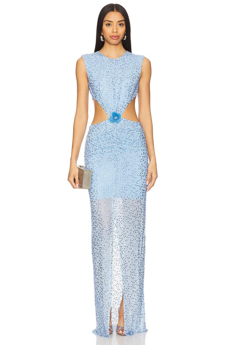 Soft satin fabric and a figure-hugging column silhouette define this light blue Valentina Dress, beautifully adorned with gemstone embellishments on the front bodice and back. The sleeveless design and round neckline enhance its elegant appeal, while the striking keyhole back and side cut-outs add a sophisticated edge. Falling in a graceful maxi length with a clean hemline, this dress is perfect for cocktail parties, date nights, and formal occasions during spring and summer. The concealed back zipper and double hook-and-eye closures provide a seamless fit for confident wear.