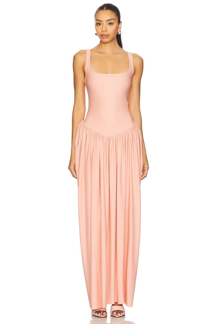 Soft matte peach jersey fabric and a fitted bodice create a sleek silhouette in this maxi dress featuring a square neckline and sleeveless design. The flared waist cascades into subtle ruffles along the skirt for elegant movement. Pull-on styling enhances comfort and ease, making it ideal for spring and summer outings. Transition effortlessly from brunch to date night or a night out with this modern and sexy dress that flatters with its flowy hemline and clean finish.