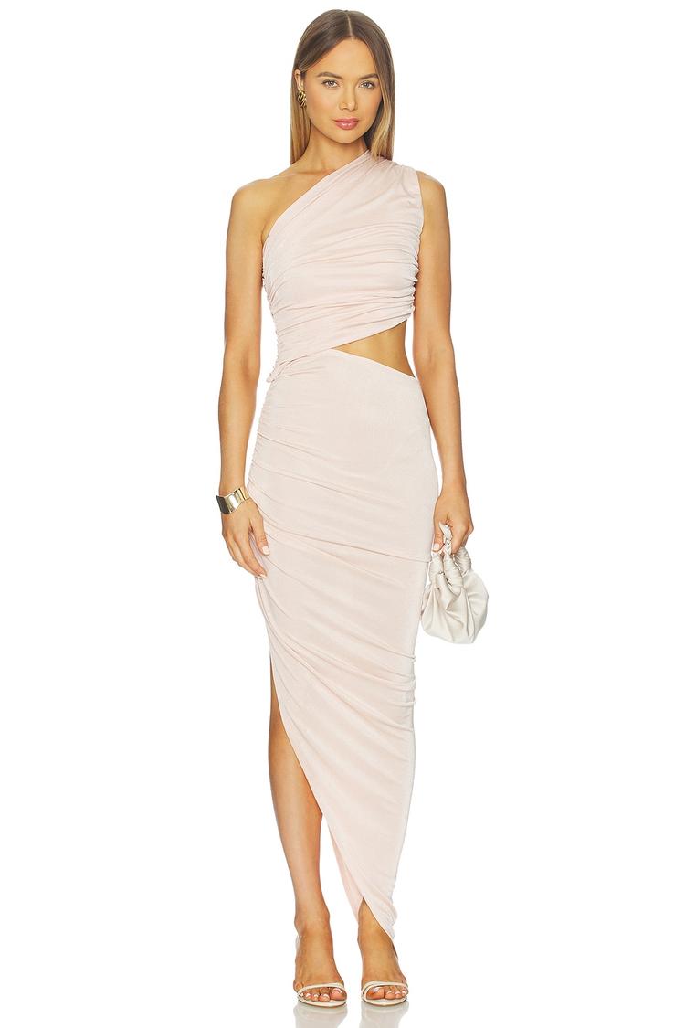 Soft matte off-white fabric and elegant ruching detail define this fitted column maxi dress. Its one-shoulder strap neckline and sleeveless cut create a sleek silhouette, while the asymmetric hemline and side cutout add a modern, sexy edge. The pull-on slip-on style with subtle ruffles makes this dress effortlessly chic and perfect for cocktail parties, date nights, or night outs. Crafted from a polyester-elastane blend, it offers both comfort and stretch, making it a sophisticated choice for spring through autumn occasions.