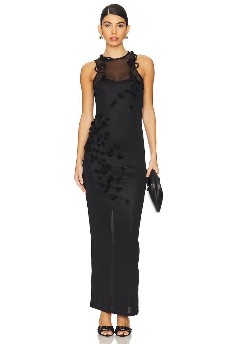 A sleek matte black column silhouette defines this maxi dress, featuring a fitted cut that elegantly skims the figure. The high neckline and sleeveless design offer a modern, sophisticated edge, while the semi-sheer mesh bodice adorned with 3D tonal floral appliques adds a delicate, feminine detail. Crafted from a stretchy blend of polyester, spandex, polyamide, and nylon, this dress is both comfortable and alluring. Perfect for cocktail parties, date nights, or an upscale night out, it balances sexy allure with timeless elegance.