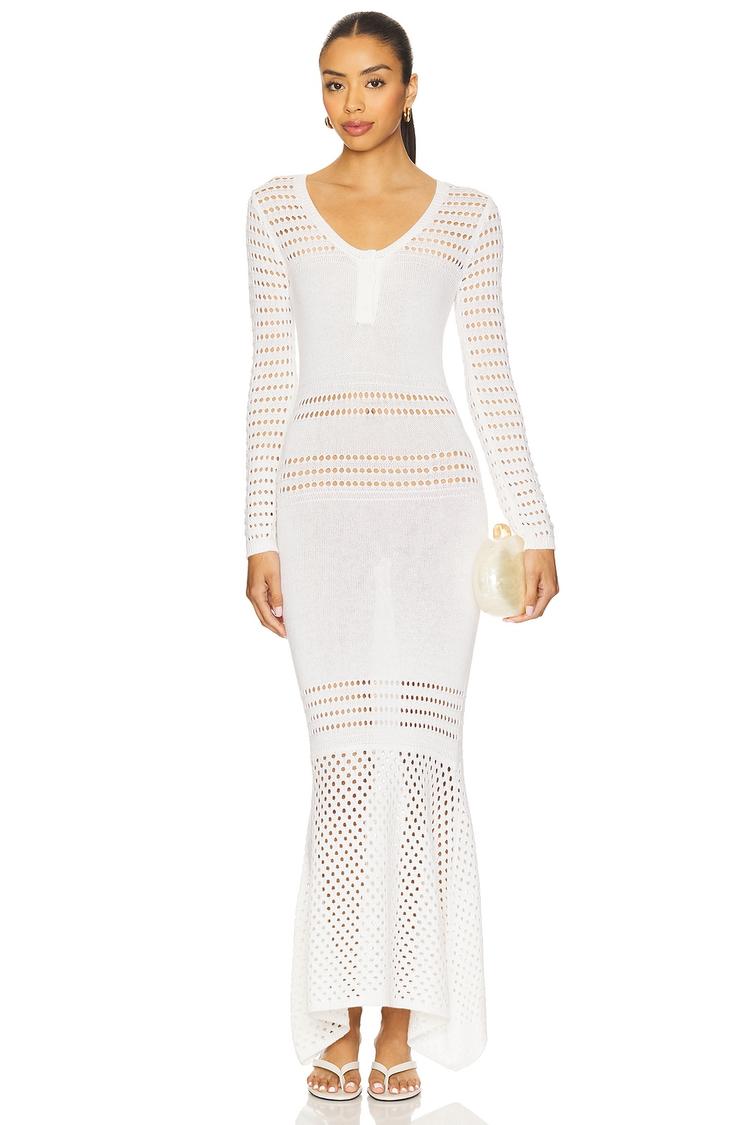 Softly textured with open crochet mesh, this white column dress features a handkerchief hemline and a slim fit that flatters the silhouette. The long sleeves and V-neck add subtle elegance, while the partial front button closure offers a refined touch. Crafted from a wool-cotton blend, it’s ideal for spring and autumn outings. Versatile for brunch, date nights, and cocktail events, the striped mesh pattern enhances its minimalist modern appeal with breathable comfort and distinctive design details.