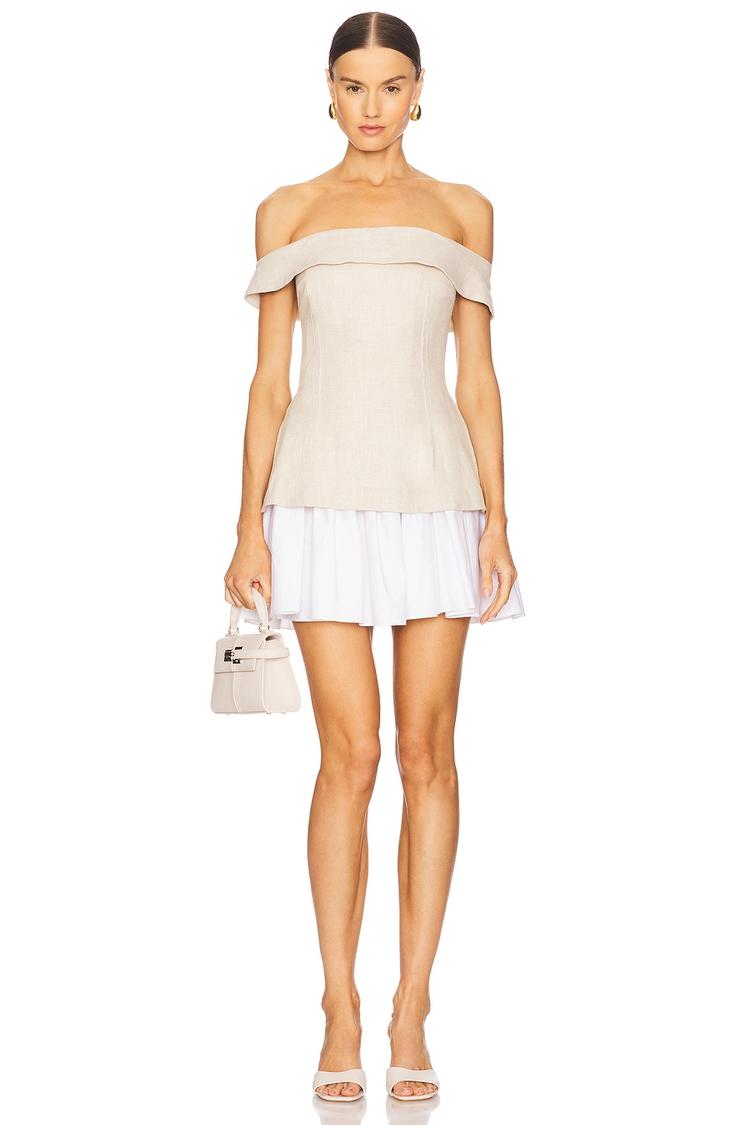 Soft ramie and cotton blend fabric with a poplin contrast skirt creates a fresh, lightweight mini shift dress ideal for warmer seasons. The off-shoulder neckline and straight neck silhouette offer a graceful yet minimalist vibe, while the ruffled hem adds a playful touch. Hidden back zipper ensures a clean finish and easy wear. Perfect for brunch, date nights, and cocktail events, this elegant dress balances classic style with subtle design details for a versatile wardrobe staple.