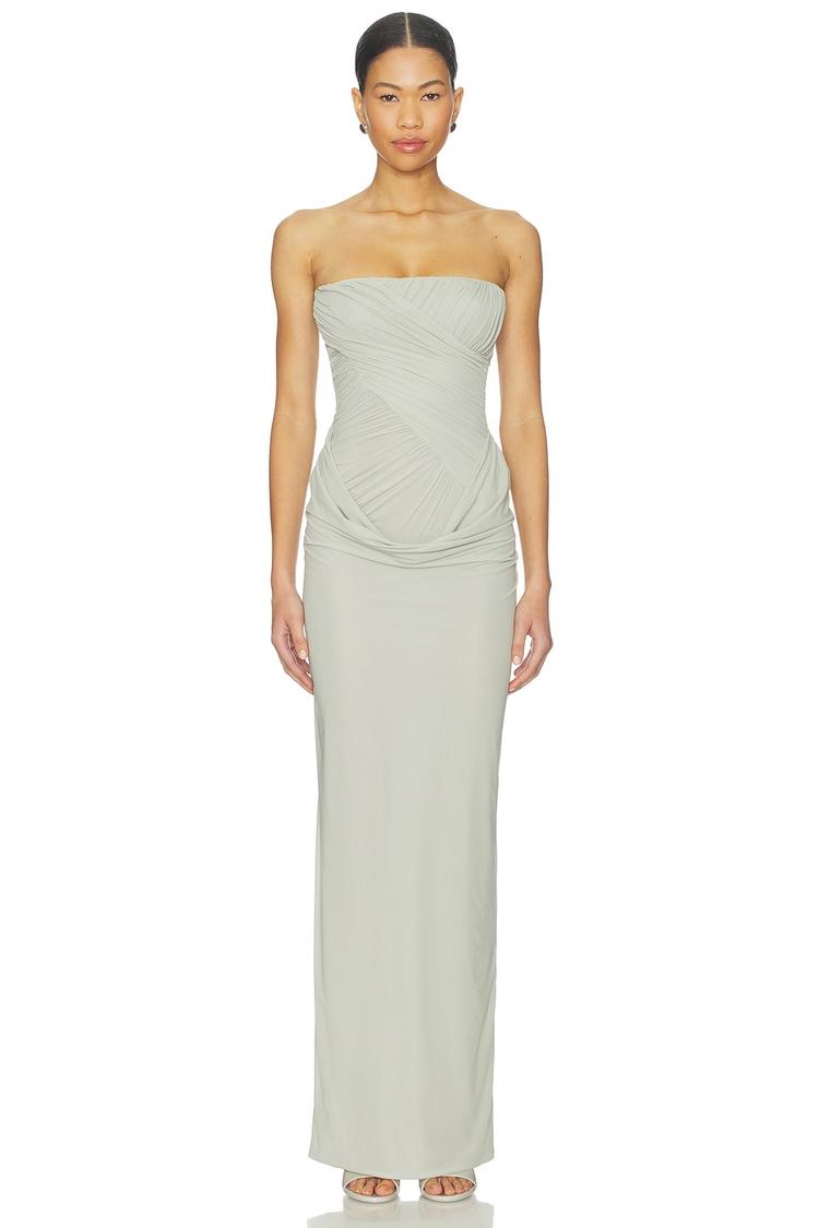 Softly ruched detailing enhances the bodycon column silhouette of this off-white strapless maxi dress, crafted from stretchy nylon ponte fabric for a sleek, flattering fit. The straight neckline and sleeveless design add minimalist elegance, perfect for cocktail parties, date nights, or sophisticated evening events. Its pull-on styling ensures effortless wear while the clean hemline and subtle ruching create refined texture throughout. An ideal choice for those seeking a chic, understated look that transitions seamlessly across seasons and occasions.