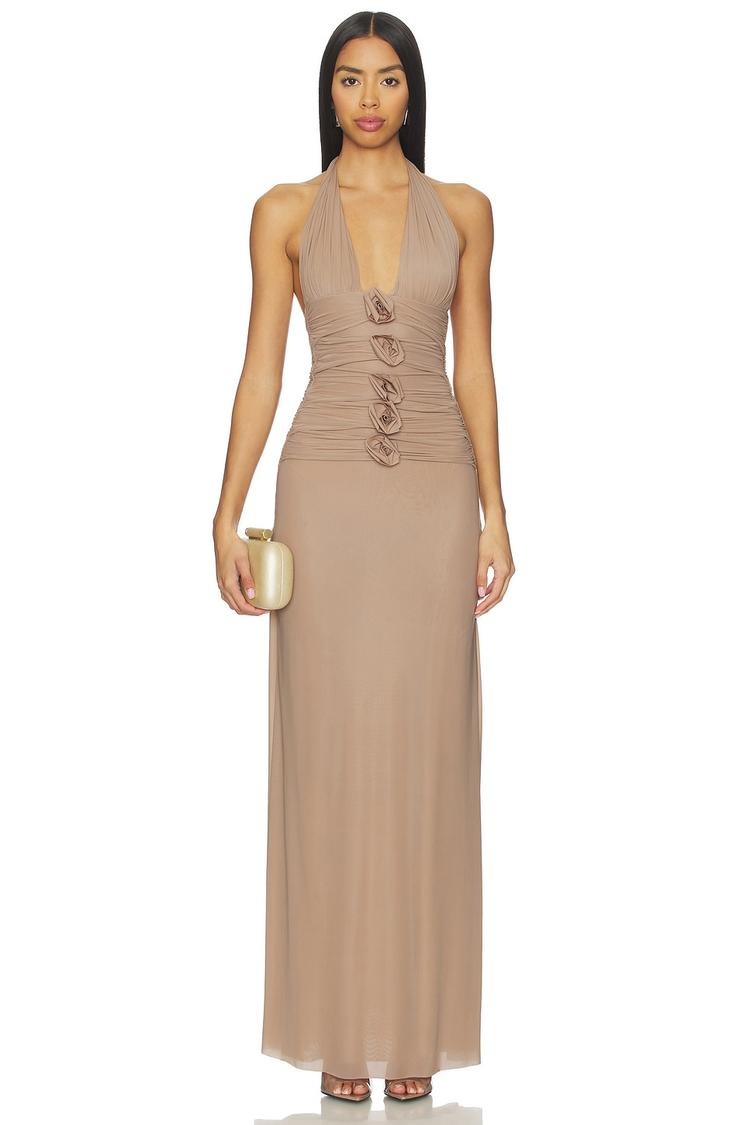 Soft matte taupe fabric shapes a sleek slip dress with a plunging neckline and open back for a bold, confident look. The bodycon fit and front ruching enhance curves while the maxi length and sleeveless design keep it elegant and suitable for warm weather. This minimalist silhouette is an ideal choice for cocktail parties, date nights, or evening events where subtle sophistication and sex appeal meet. Crafted from a nylon-elastane blend, it offers a comfortable stretch fit with a smooth finish, perfect for effortless style that turns heads.