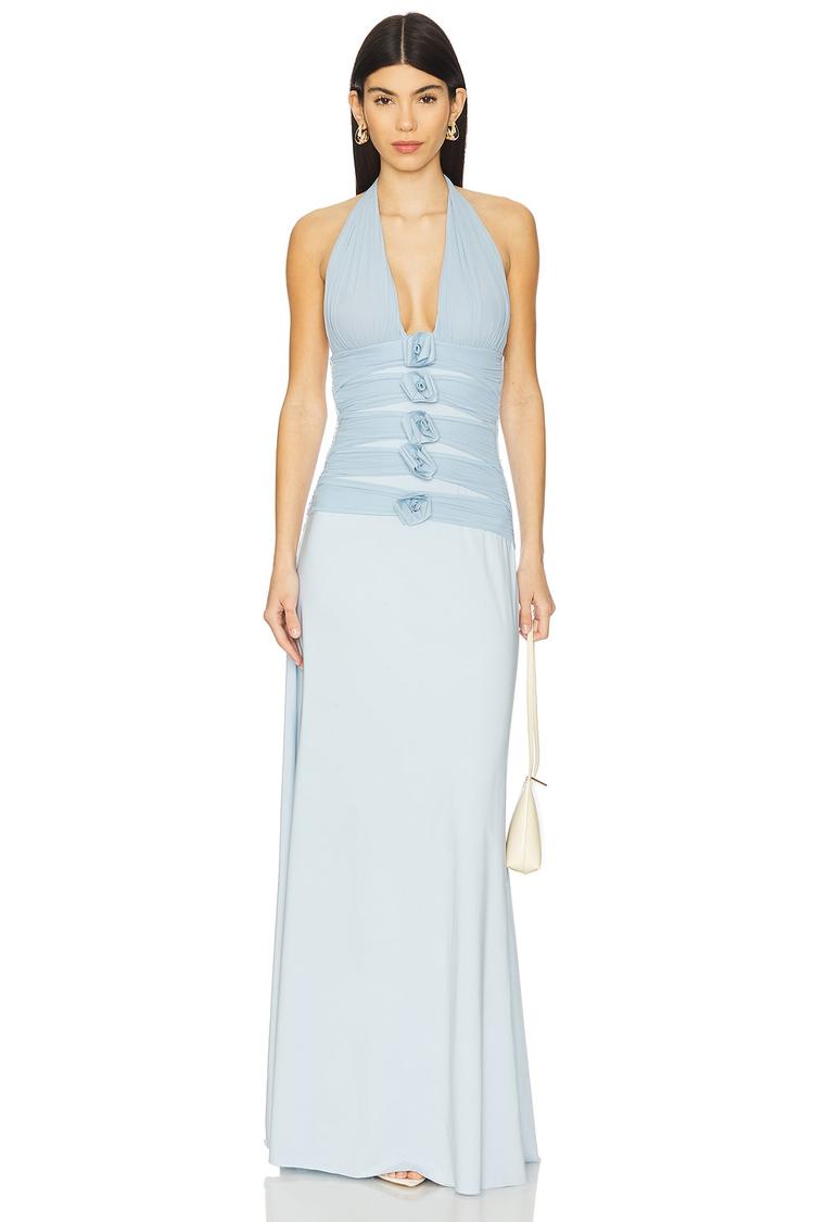 Soft matte light blue fabric with a figure-hugging column silhouette defines this elegant maxi dress. The halter neck and strapless sleeveless design highlight a sexy open back, while front draped 3D floral appliques and ruching add sophisticated texture to the bodice. Crafted from midweight coated nylon jersey, this fully lined dress combines comfort with style. Ideal for cocktail evenings, date nights, or night outs, it offers a modern yet timeless look for versatile occasions across all seasons.