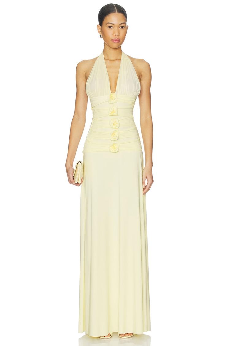 Soft matte cream crepe fabric shapes a sleek column silhouette with a flattering halter neck and open back, perfect for evening elegance. The slim fit hugs the body with subtle front floral appliqué details adding a refined touch. Flowing to a clean maxi hem, this fully lined design blends modern sophistication with sexy allure. Ideal for cocktail parties, formal events, or a stylish night out, its stretchy nylon-elastane blend ensures comfort and movement with a polished finish.