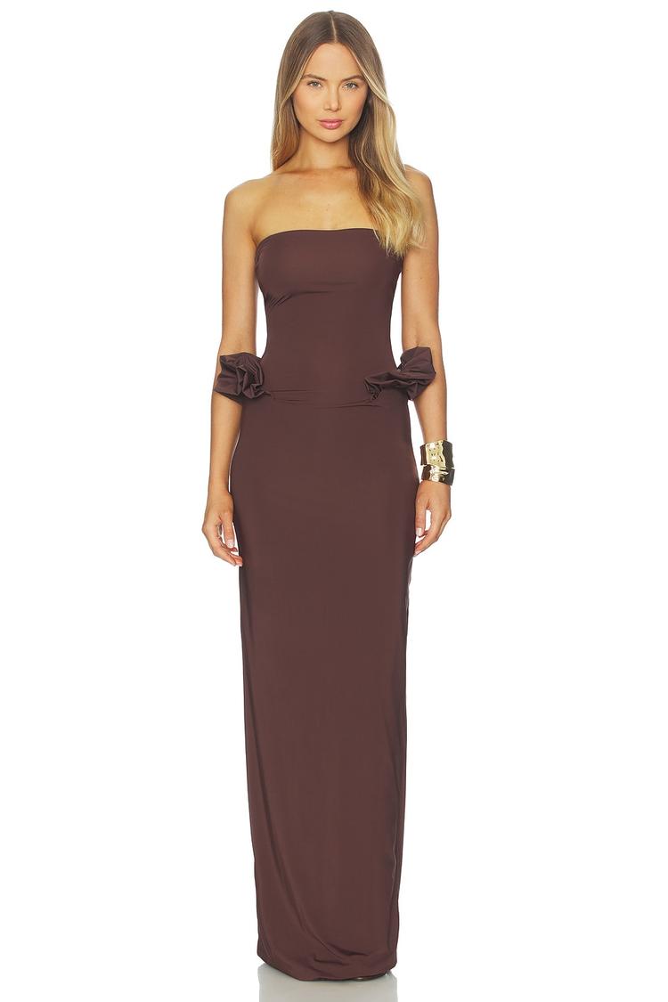 Sleek and elegant, this matte brown column dress features a straight neckline and strapless sleeveless design that flatters the silhouette. Crafted from midweight jersey fabric, it offers a close fit that skims the body gracefully down to a clean maxi hemline. The standout ruffled trim at the waist adds a sophisticated touch of texture and interest. Ideal for cocktail parties, date nights, and night outs, this minimalist and refined dress balances comfort with style effortlessly, making it a versatile addition to your evening wardrobe.