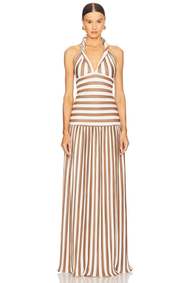 Soft matte beige and white stripes flow elegantly in this slim-fitting column maxi dress, crafted from midweight plissé polyester and spandex fabric. Featuring a halter neck with a self-tie closure and a hidden back zipper, the design highlights a sophisticated drop waist silhouette and a clean hemline. Ideal for summer occasions like brunch, date nights, or evening events, this eco-friendly maxi offers both comfort and style with its sleeveless, strapless-inspired look and breathable fabric texture.