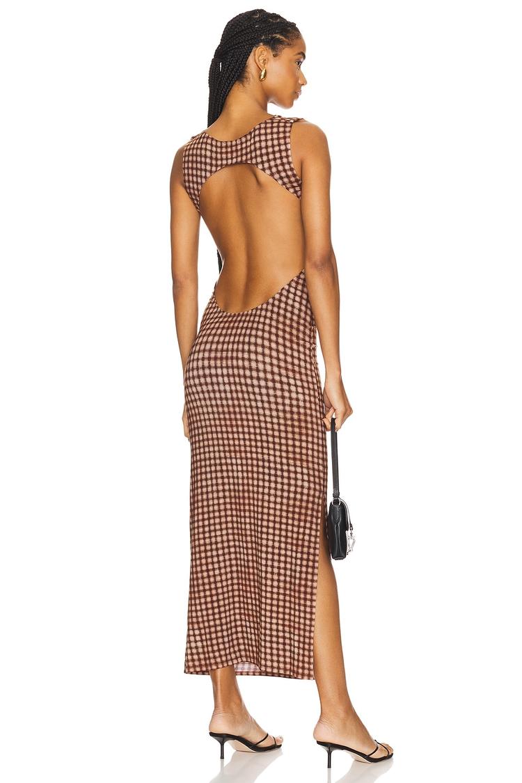The Selena Dress features a sleek sheath silhouette with a fitted shape that beautifully contours the body. Crafted from stretch jersey fabric blending lyocell and elastane, it promises both comfort and elegance. Its midi length and side slit add a touch of allure, complemented by a daring open back and wide strap sleeveless design. The all-over checkered pattern in matte brown and cream hues enhances its modern, chic vibe. Perfect for date nights, cocktail parties, and stylish evenings out during spring, summer, or autumn.