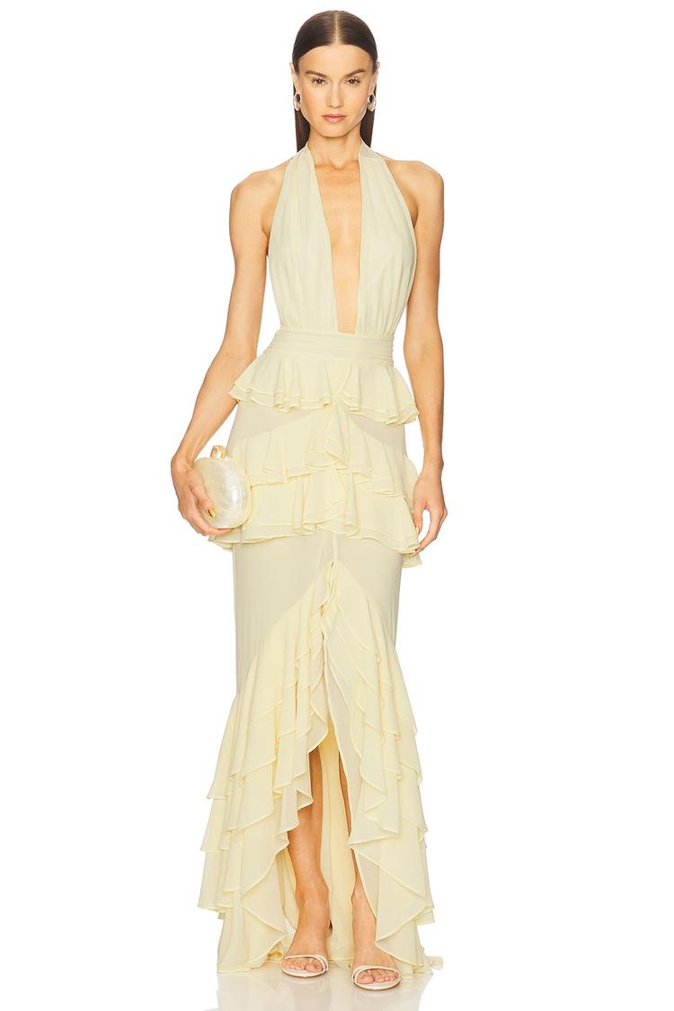 Soft matte beige chiffon cascades in tiered ruffles across a slim column silhouette, creating a stunning maxi gown. The plunging neckline and halterneck tie closure add an elegant, open-back detail, while the concealed zipper ensures a sleek fit. Perfectly suited for formal occasions, galas, and cocktail parties, this gown blends sophistication and flair with its dramatic ruffled hem and layered tiers. Crafted from heavyweight polyester chiffon, it offers both structure and fluidity for a captivating evening look.